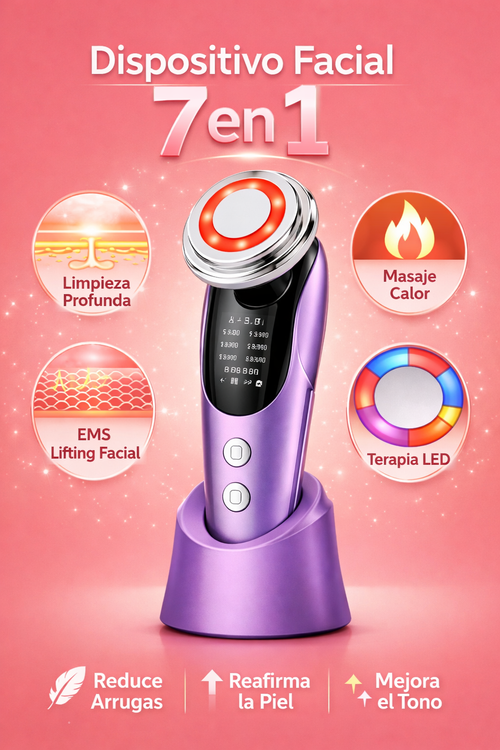 Dispositivo facial con microcorriente EMS, masaje térmico y terapia LED para limpiar profundamente la piel, reducir arrugas y mejorar la luminosidad del rostro.